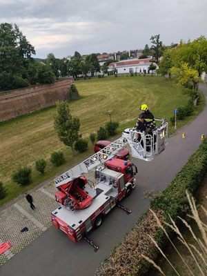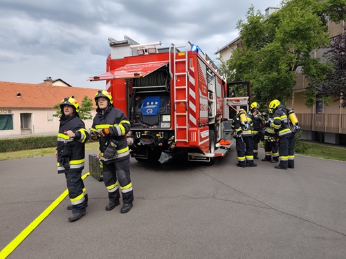 Der Atemschutztrupp der FF Bad Radkersburg verlegte eine Löschleitung, konnte den Brand eindämmen und in Folge ablöschen. Auch wurde mit der Druckbelüftung des verrauchten Bereiches begonnen. In der Zwischenzeit wurde die Drehleiter im Stadtpark in Stellung gebracht und für die Menschenrettung vorbereitet.